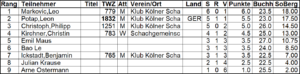 Am Freitag, den 5. Dezember fand ein Schacharten-/Nikolausturnier statt. Da in Erftstadt gleichzeitig das Brötchen-Blitz-Turnier stattfand, kam man im KKS in kleiner Runde zusammen. Es wurden 5 Runden mit einer Bedenkzeit von 5+3 Minuten gespielt: Berolinabauer, Räuberschach, 3-Check, Fußballschach, King of the Hill).